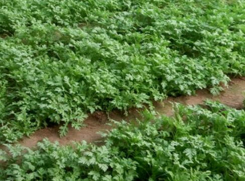 茼蒿播种至发芽出苗,一般需5-7天时间。在发芽期间要注意保湿防止土壤干燥。当苗高2-3厘米、1-2片真叶时进行间苗和田间拔苗,使株距保持1-2厘米。并进行浅中耕,待幼苗在3-4片真叶期定植,定植的外界或棚内温度要稳定通过10℃.定植或定苗株距要在4-6厘米。第一次间苗时浇水一次,定苗后再浇水,且随水追肥速效氮肥。以后可以分次间苗采收。