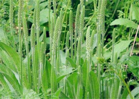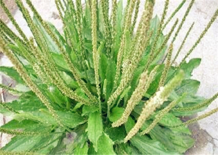 2、车前,又名:车前草、五根草,车轮菜,多年生草本,连花茎高达50厘米,具须根。具有祛痰、镇咳、平喘等作用。生长在山野、路旁、花圃、河边等地。根茎短缩肥厚,密生须状根。叶全部根生,叶片平滑,广卵形,边缘波状,间有不明显钝齿,主脉五条。