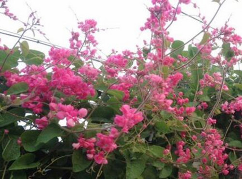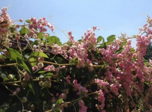 珊瑚藤花形娇柔,花期极长,色彩艳丽,繁花满枝,美丽异常,珊瑚藤花繁且具微香,是夏季难得的名花。