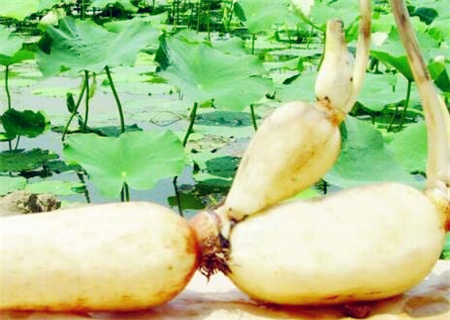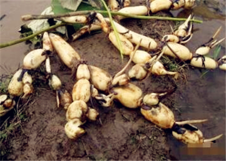 4、理顺藕头:6月份藕藤迅速向四周生长,要进行人工理藤,于中午时刨开泥巴拉起藕藤,转头理向空白地再埋入土中即可。
