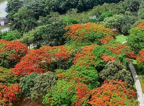 1.凤凰树树冠高大,花期花红叶绿,满树如火,富丽堂皇,由于“叶如飞凰之羽,花若丹凤之冠”,故取名凤凰木。是著名的热带观赏树种。在我国南方城市的植物园和公园栽种颇盛,作为观赏树或行道树。