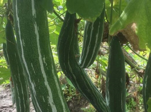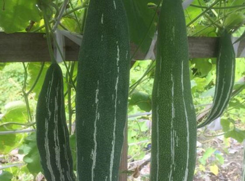 蛇瓜自瓜柄开始有数条绿色线纹,瓜体有的垂直,有的弓身,有的弯曲,有的卷尾,酷似—条条长蛇在棚架下展姿。在嫩瓜期,瓜体表面有白绿色相间的条纹似白花蛇,老熟后的瓜体表面又呈现红绿色相间的条纹似红花蛇,体态各异,栩栩如生,稀奇而美观。