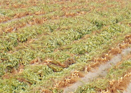 适时机械收获,及时晾晒烘干。当花生植株由绿变黄、主茎保留3—4片绿叶、大部分荚果饱满成熟时,及时应用花生挖掘机收获,具体收获期应根据天气情况灵活掌握。麦后直播花生只要后期温度许可,可尽量延长生育时期。收获后应抓紧晾晒或烘干干燥,使荚果含水量尽早降到10%以下,降低霉捂和黄曲霉毒素污染的发生风险。为提高花生品质品相,要尽量做到分品种专收专储。