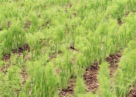 4、间苗定苗,出苗前后应及时中耕除草,破除土壤板结,有利于幼苗生长发育;同时待茴香长出2~3片真叶,苗高4~5厘米时即可间苗,并适度浇水,喷施新高脂膜保护幼苗,提高抗病能力,保护幼苗茁壮成长。