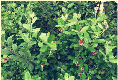 费约果树高5~6米,树皮灰白色,枝条披垂,节膨大,叶柄短,叶厚革质,叶面有光泽,叶背有银灰色茸毛。花单生,直径4.O厘米,外被白色绒毛,内带紫色,花瓣倒卵形,花两性,有丛状、直立紫色的雄蕊,花丝顶端为圆形金黄色花药。